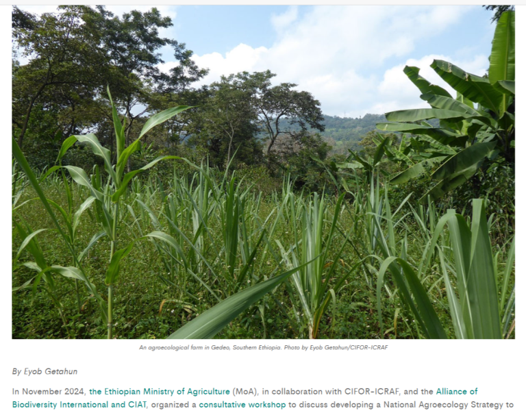2025Experts convene to shape Ethiopia’s National Agroecology Strategy, by Eyob Getahun Read the event article on a five-day writeshop organized in August 2025 by the Ethiopian Ministry of Agriculture (MoA), in collaboration with CIFOR-ICRAF, and the Alliance of Biodiversity International and CIAT, to collect expert inputs on the proposed Ethiopia national agroecology strategy.