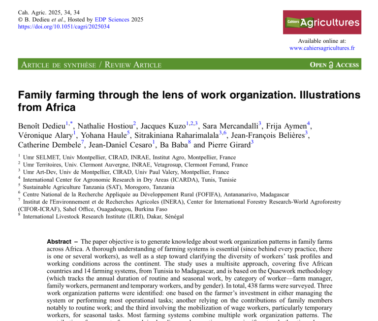 2025DownloadIllustrations from Africa. Dedieu et al. 2025 This paper’s objective is to generate knowledge about work organization patterns in family farmsacross Africa. The study uses a multisite approach, covering five African countries and 14 farming systems, from Tunisia to Madagascar, and is based on the Quaework methodology. Most farming systems combine multiple work organization patterns….