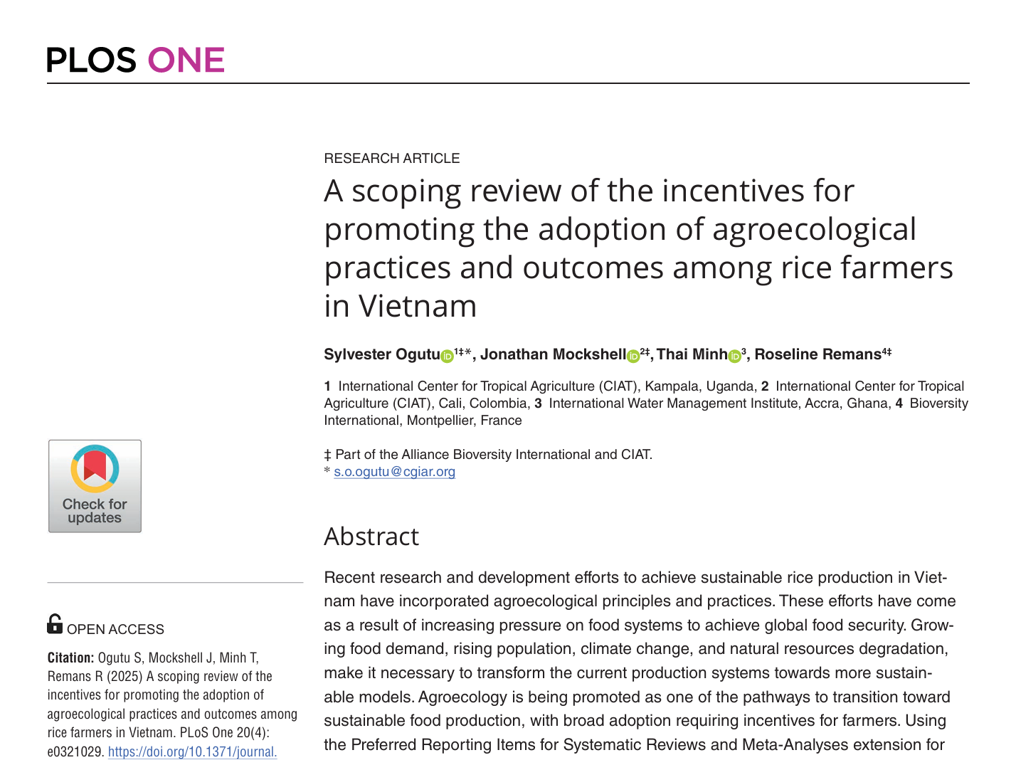 Ogutu S, Mockshell J, Minh T, Remans R (2025) Using the Preferred Reporting Items for Systematic Reviews and Meta-Analyses extension for Scoping Reviews guidelines, a scoping review of 120 articles was conducted to understand the incentives applied for promoting agroecological practices, whether and how the incentives promote the adoption of agroecological practices, and their relationship…