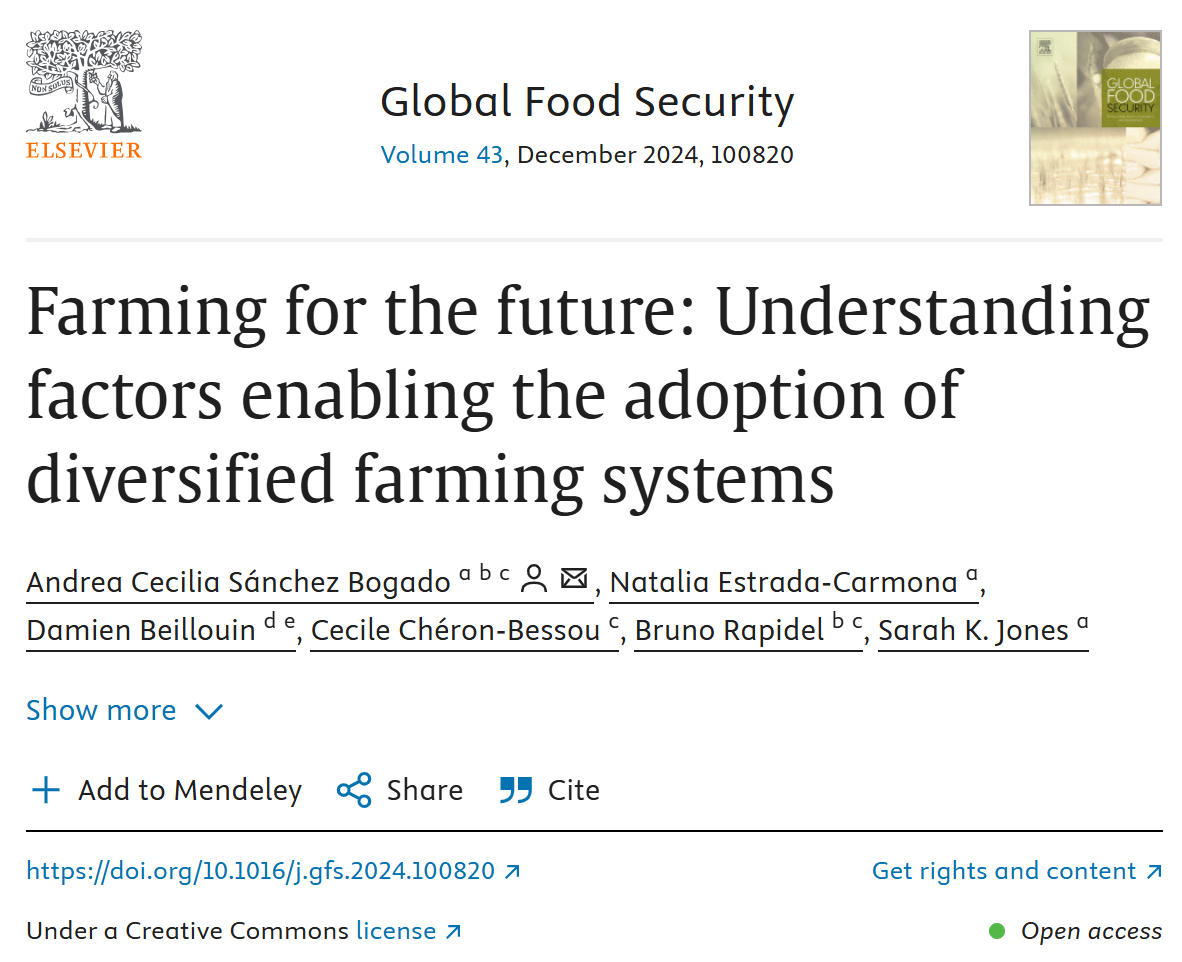 Understanding factors enabling the adoption of diversified farming systems. Andrea Cecilia Sánchez Bogado, Natalia Estrada-Carmona, Damien Beillouin, Cecile Chéron-Bessou, Bruno Rapidel, Sarah K. Jones (2024) This study presents a comprehensive global meta-analysis of 154 peer-reviewed studies analysing factors influencing adoption