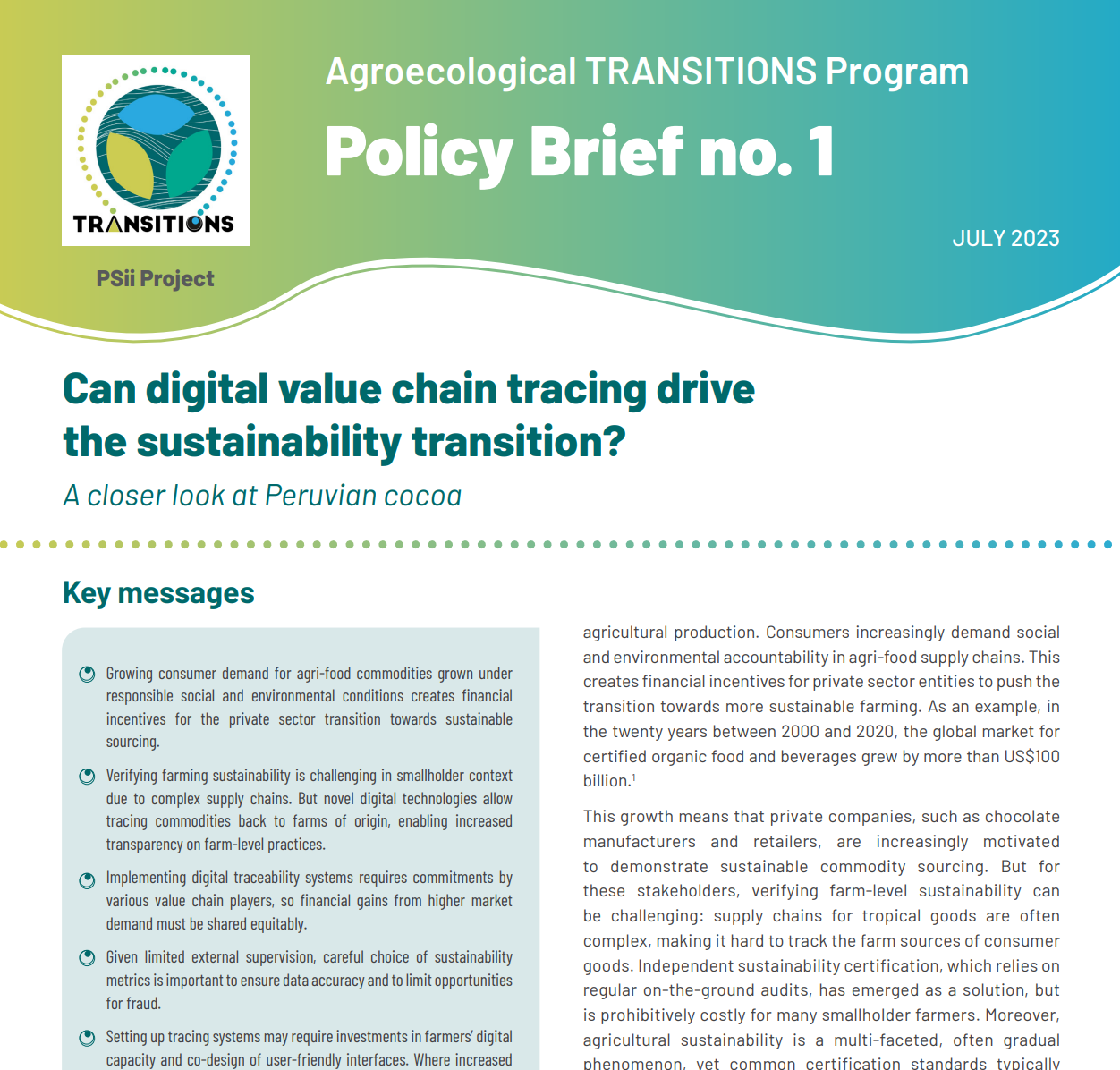 A closer look at Peruvian cocoa Policy Brief produced by Component 2 team of Psii project. Steinke, J.; Ivanova, Y.; Jones, S.; Minh, T.T.; Sanchez Bogado, A.C.; Sanchez Choy Sanchez, J.G.; Mockshell, J. (2023)