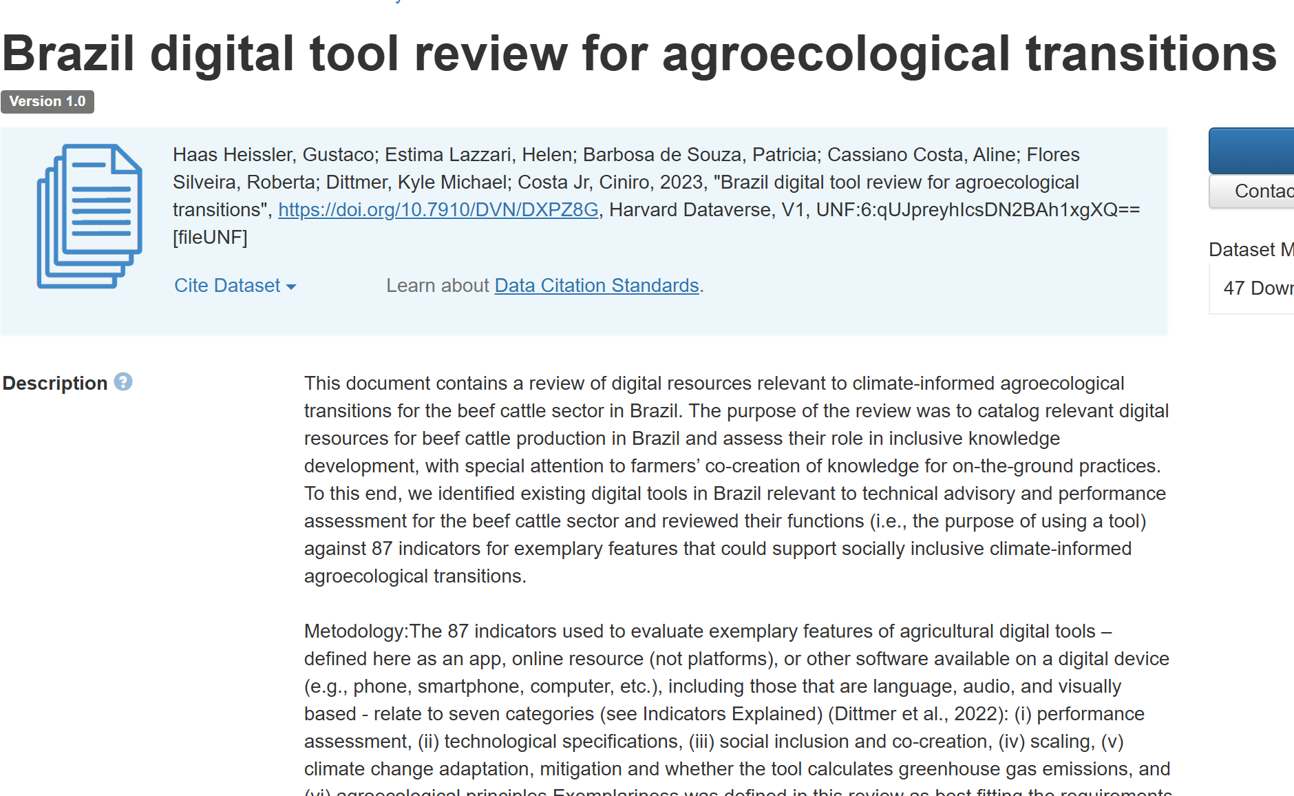 Heissler, G.H.; Lazzari, H.E.; Barbosa de Souza, P.; Costa, A.C.; Silveira, R.F.; Dittmer, K.M.; Ciniro Costa, J. (2023) This document contains a review of digital resources relevant to climate-informed agroecological transitions for the beef cattle sector in Brazil.