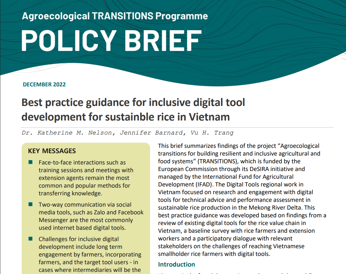 Nelson, K.M.; Barnard, J.; Vu, H.T. (2022) This brief summarizes findings of the project “Agroecological transitions for building resilient and inclusive agricultural and food systems” (Transitions)