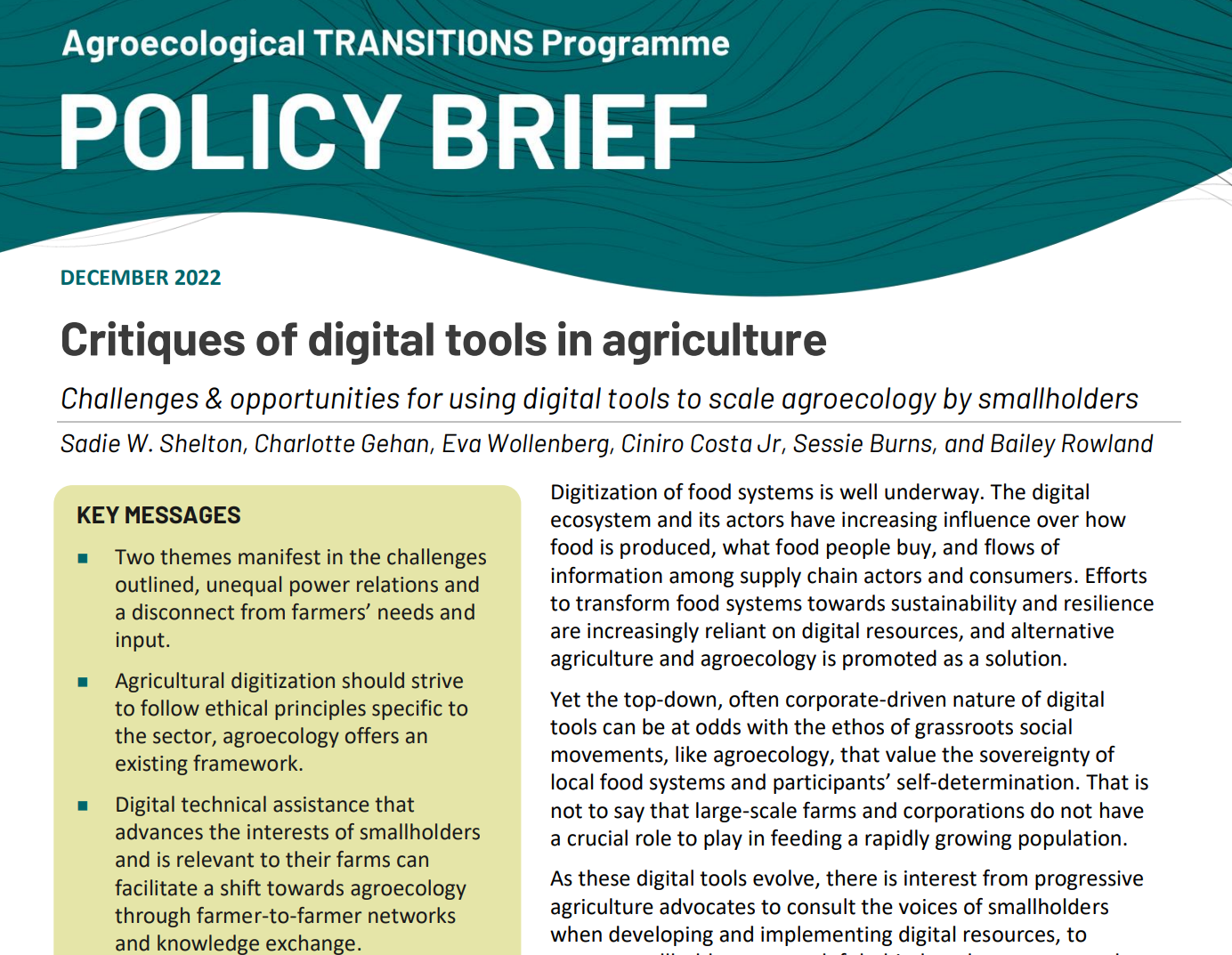 Challenges and opportunities for using digital tools to scale agroecology by smallholders Shelton, S.W.; Gehan, C.; Wollenberg, E.; Costa Jr, C.; Burns, S.; Rowland, B. (2022)